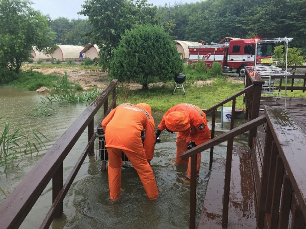 이날 오전 9시 10분경 남애리 소재 주택에 차도에서 빗물이 유입되면서 물이 차 수중펌프를 활용, 2시간 30동안 약 5톤가량의 배수 작업을 진행했다.